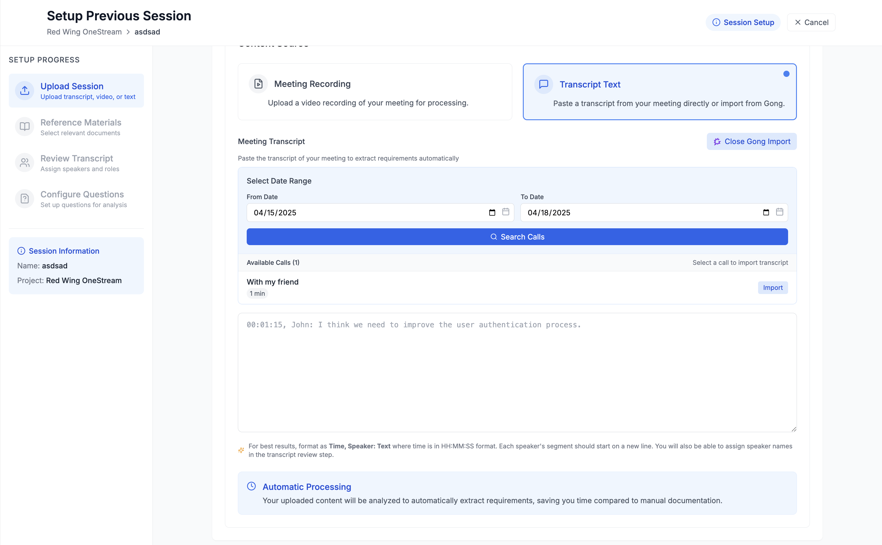 Auctor allowing you to select and import specific sales call recordings and transcripts. Once imported, Auctor's AI automatically analyzes the conversations to extract key customer requirements. These insights are then organized in your Auctor workspace, helping product teams build solutions based on actual customer feedback.