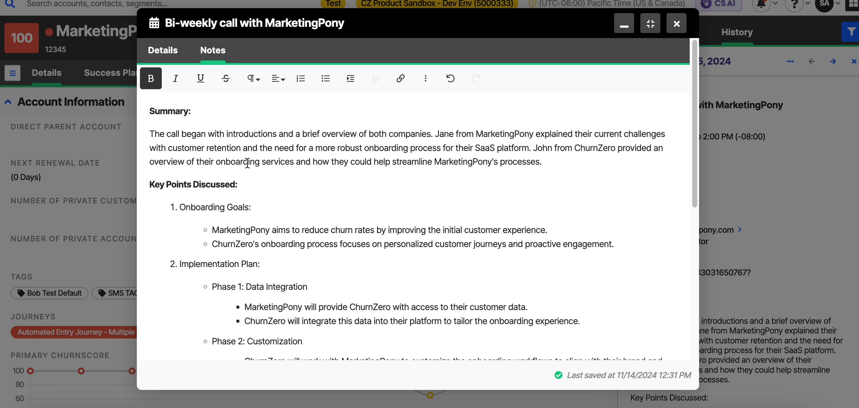 Prepare for or debrief after customer calls with supplemental insights on each account's current standings. Understand customer health, sentiment, adoption, and Journey experiences to create meaningful and relevant conversations driven by insights.