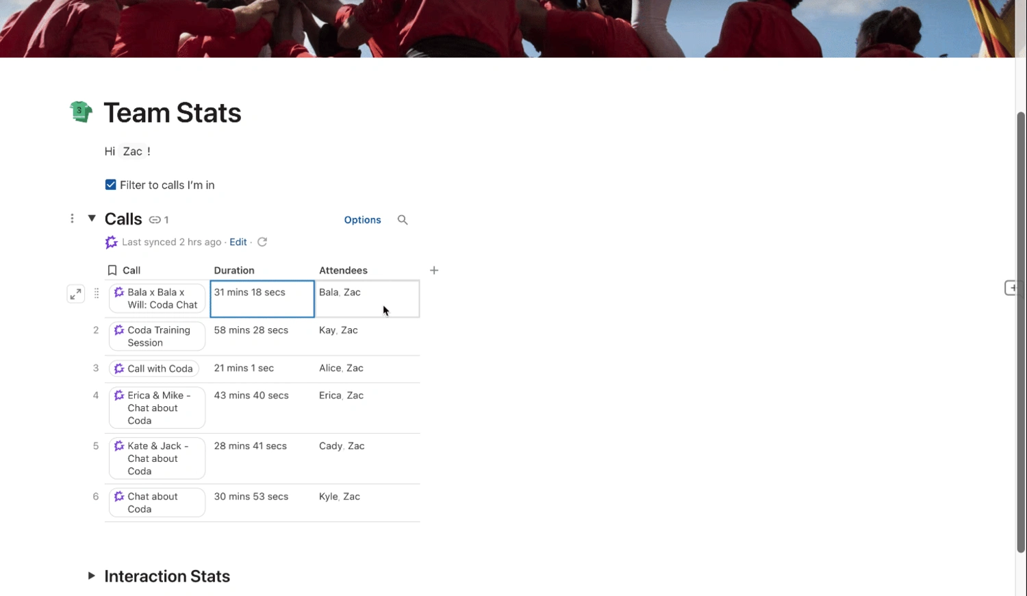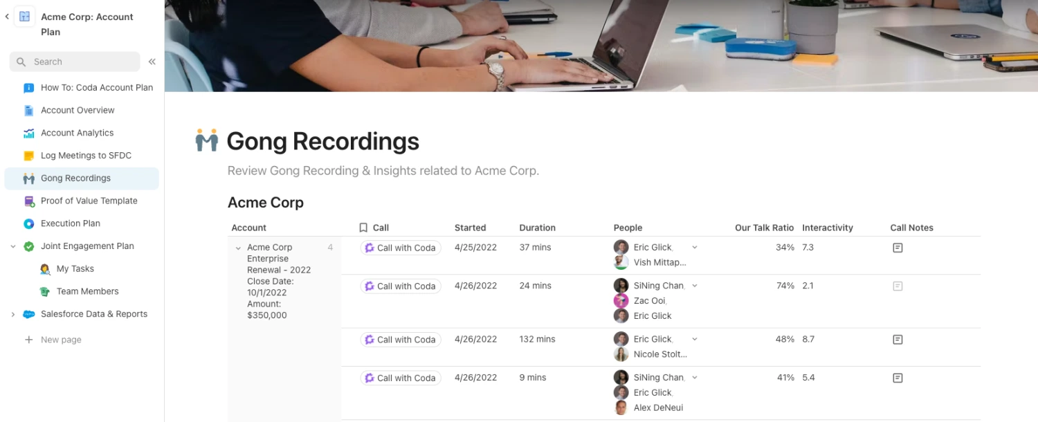 With this integration, whether it’s a kanban board of to-dos or graphing how the team spent time across different clients, Coda lets users organize Gong data as they see fit.