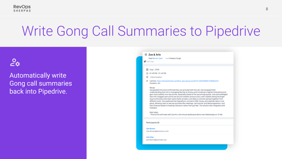 - Bi-Directional Data Flow: Sync CRM data from Pipedrive into Gong while automatically adding call summaries back to Pipedrive.