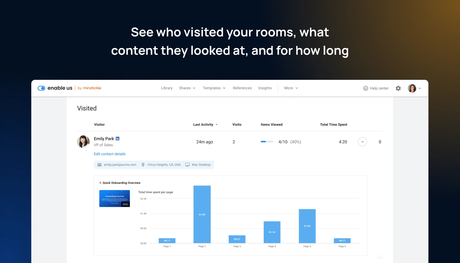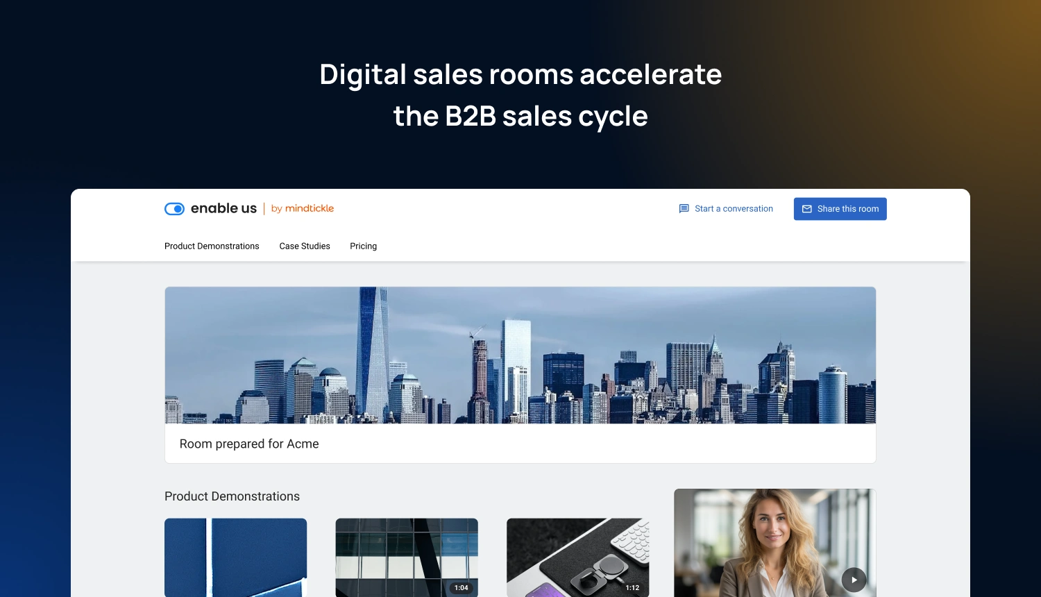 Enable Us by Mindtickle is redefining digital buying experiences for sellers and buyers - offering a Digital Sales Room solution that empowers sellers to build digital buying experiences which engage buyers and get deals done faster. Sellers curate relevant content, mutual action plans, and signable documents tailored to the prospect’s needs.