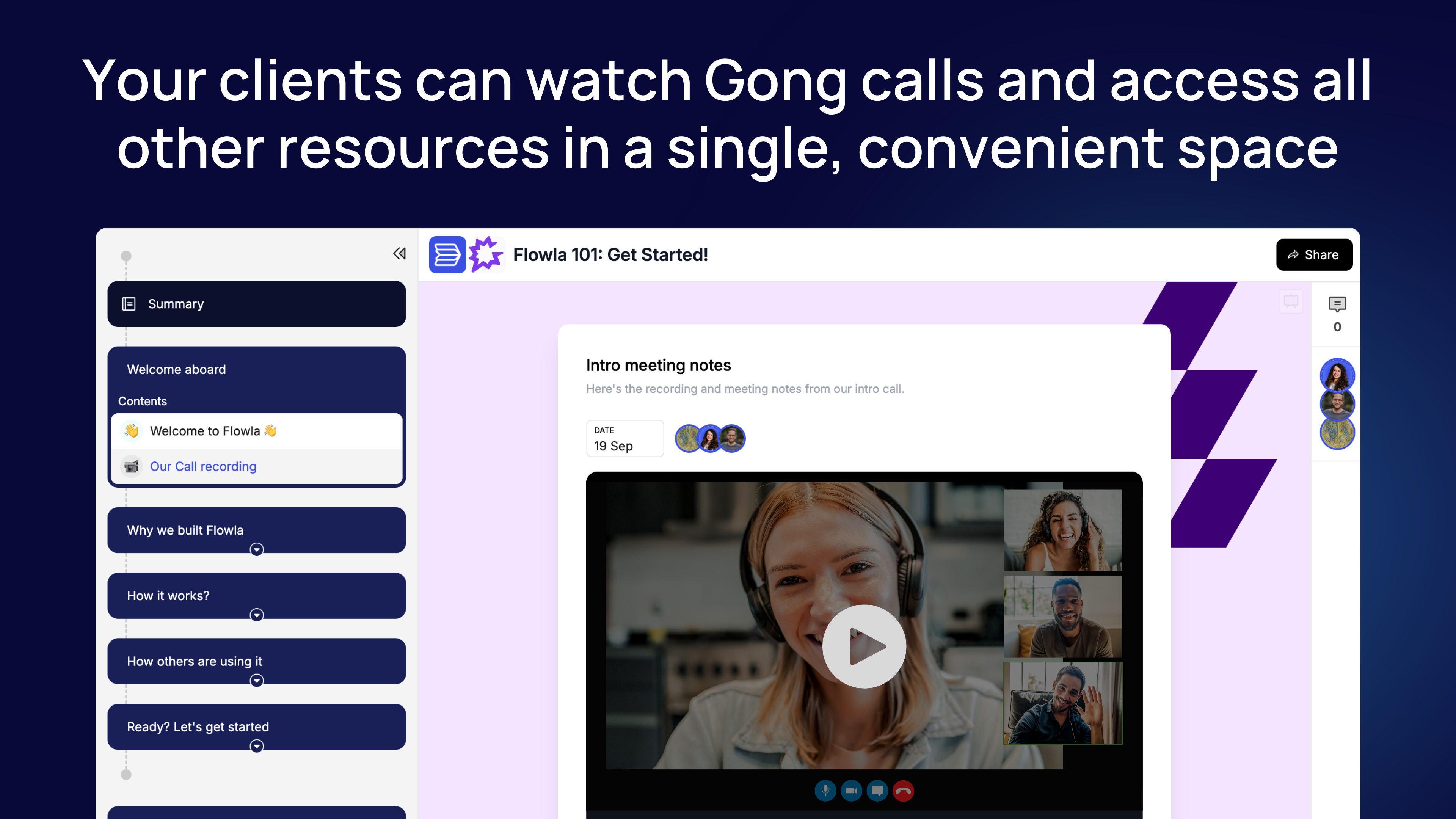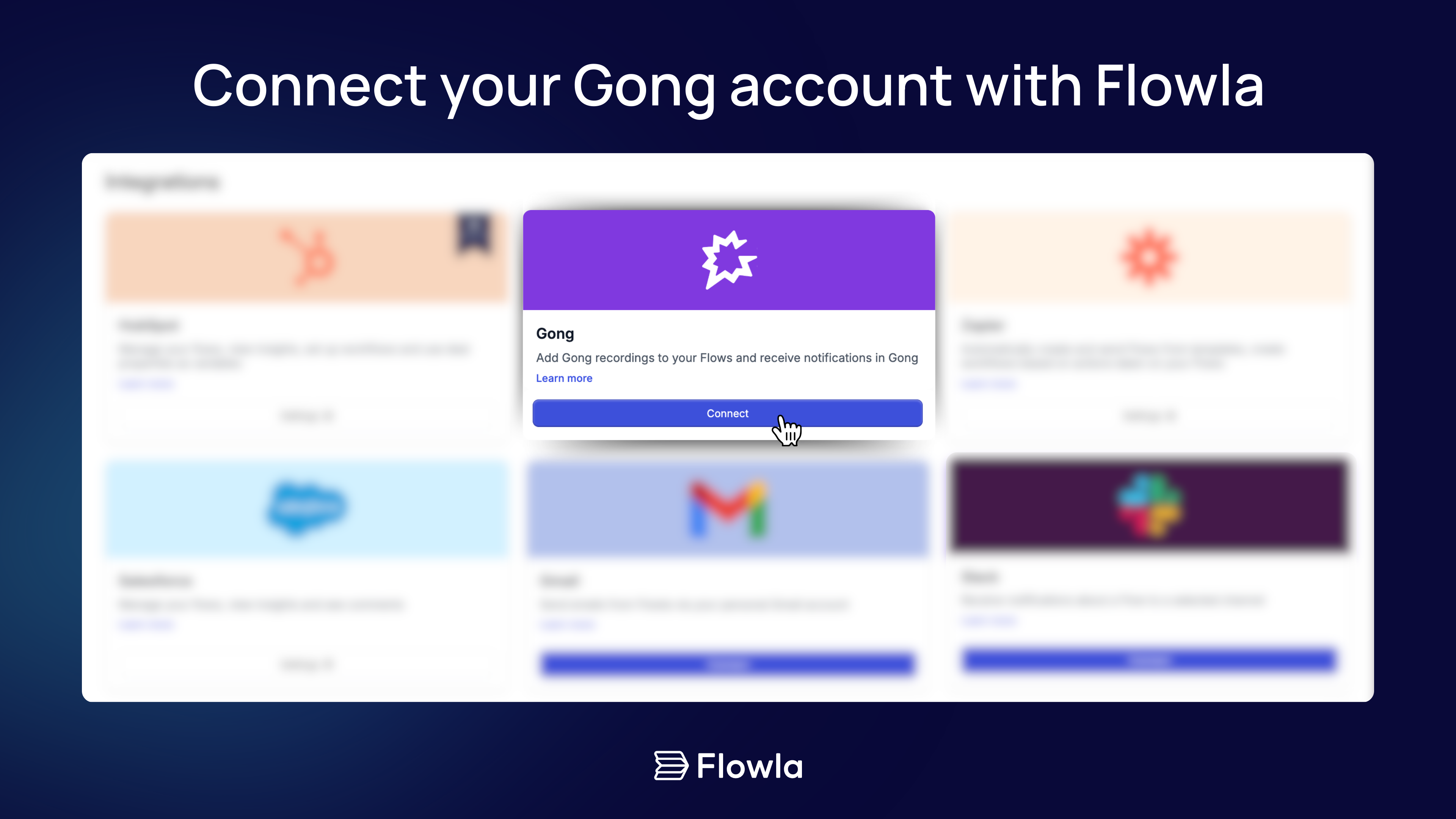 This integration enables users to view all their Gong calls from inside Flowla, then easily select and embed recordings to their flows to unite all client communications.