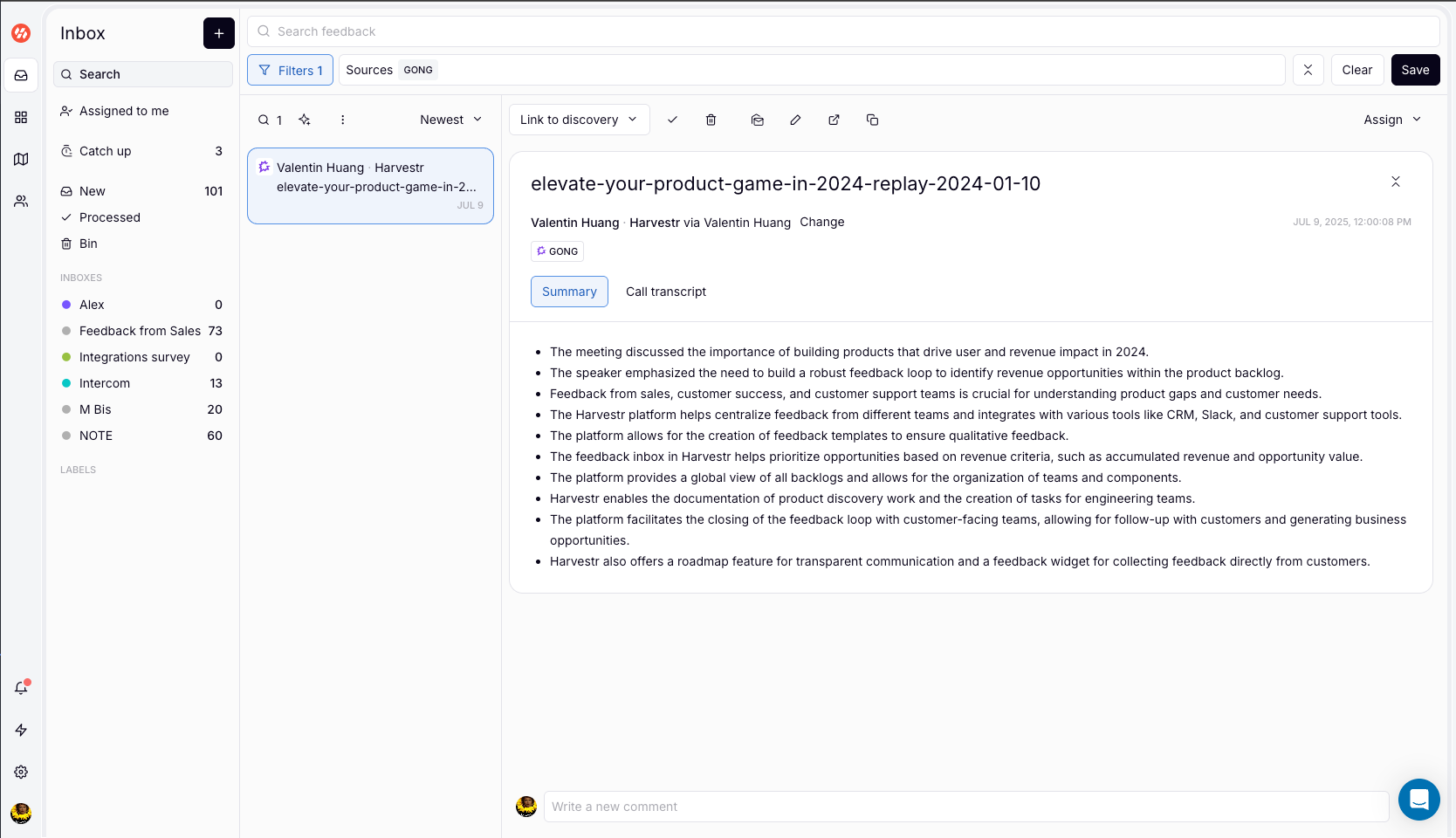 Automatically create product feedback when specific Smart Trackers are detected in recorded calls. This integration works by sending a webhook from Gong to Harvestr whenever a call matches your criteria.