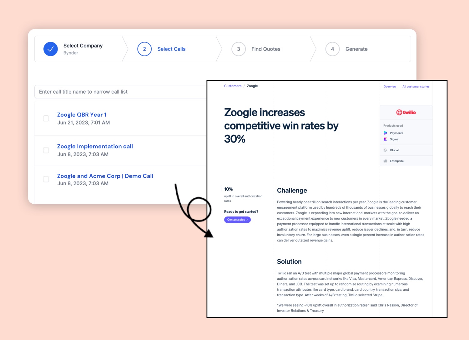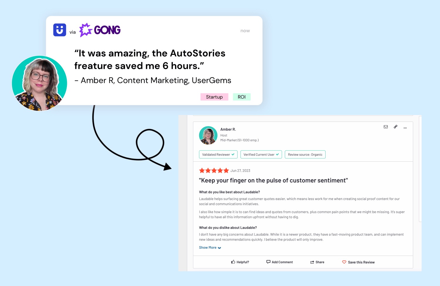 This integration enables users to find customer advocates, testimonials, 5-star reviews hiding in Gong Call recordings - and use them to win more deals.