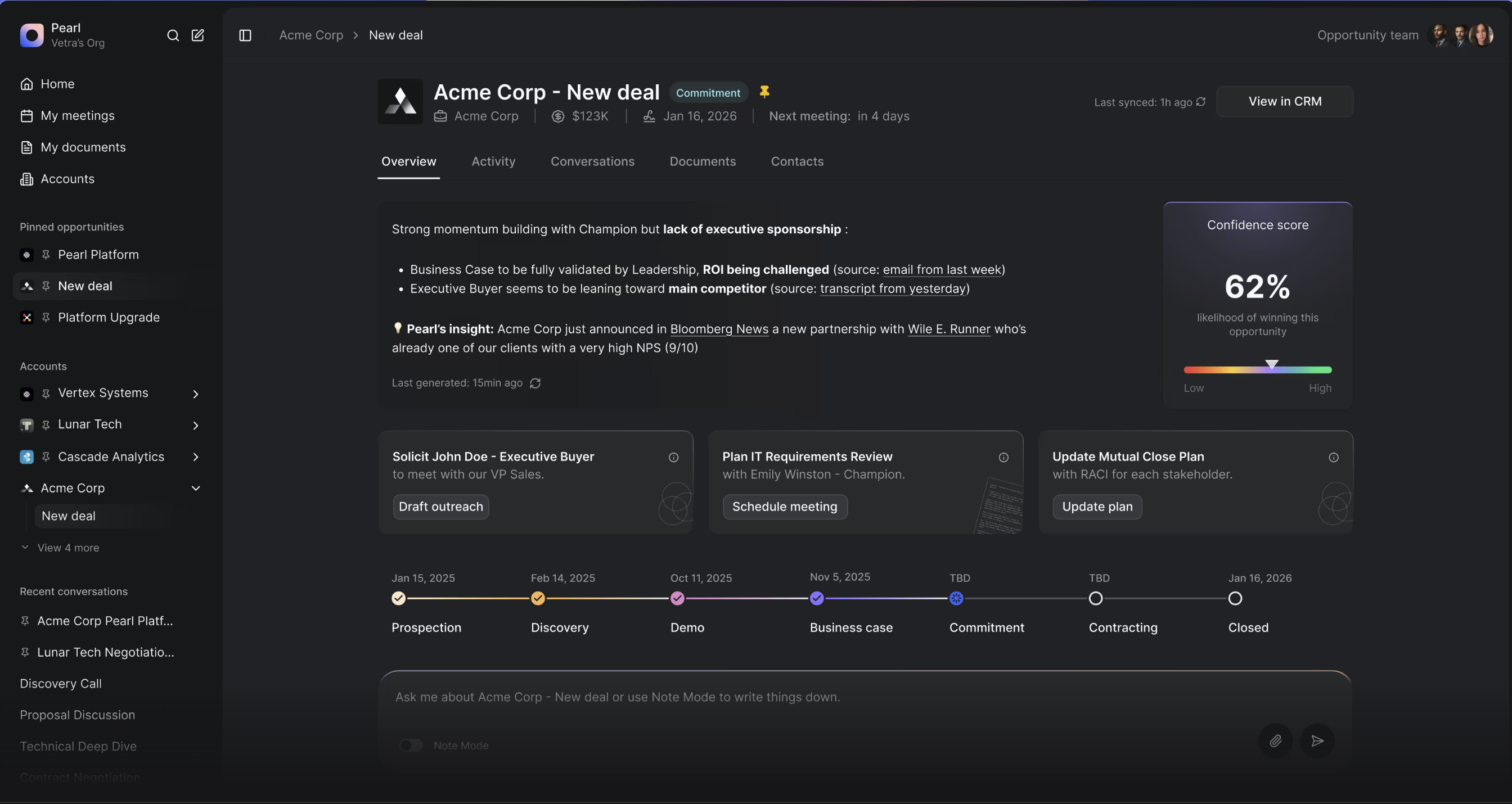 Pearl connects your Gong conversation intelligence with your CRM data to deliver actionable insights, meeting briefs, and recommendations — all in one place. By combining call recordings, deal context, and team activity, Pearl transforms scattered information into focused actions through collaborative intelligence. Reps get AI-generated meeting prep, automated activity logging, and real-time CRM sync — so they spend less time switching tools and more time closing deals.