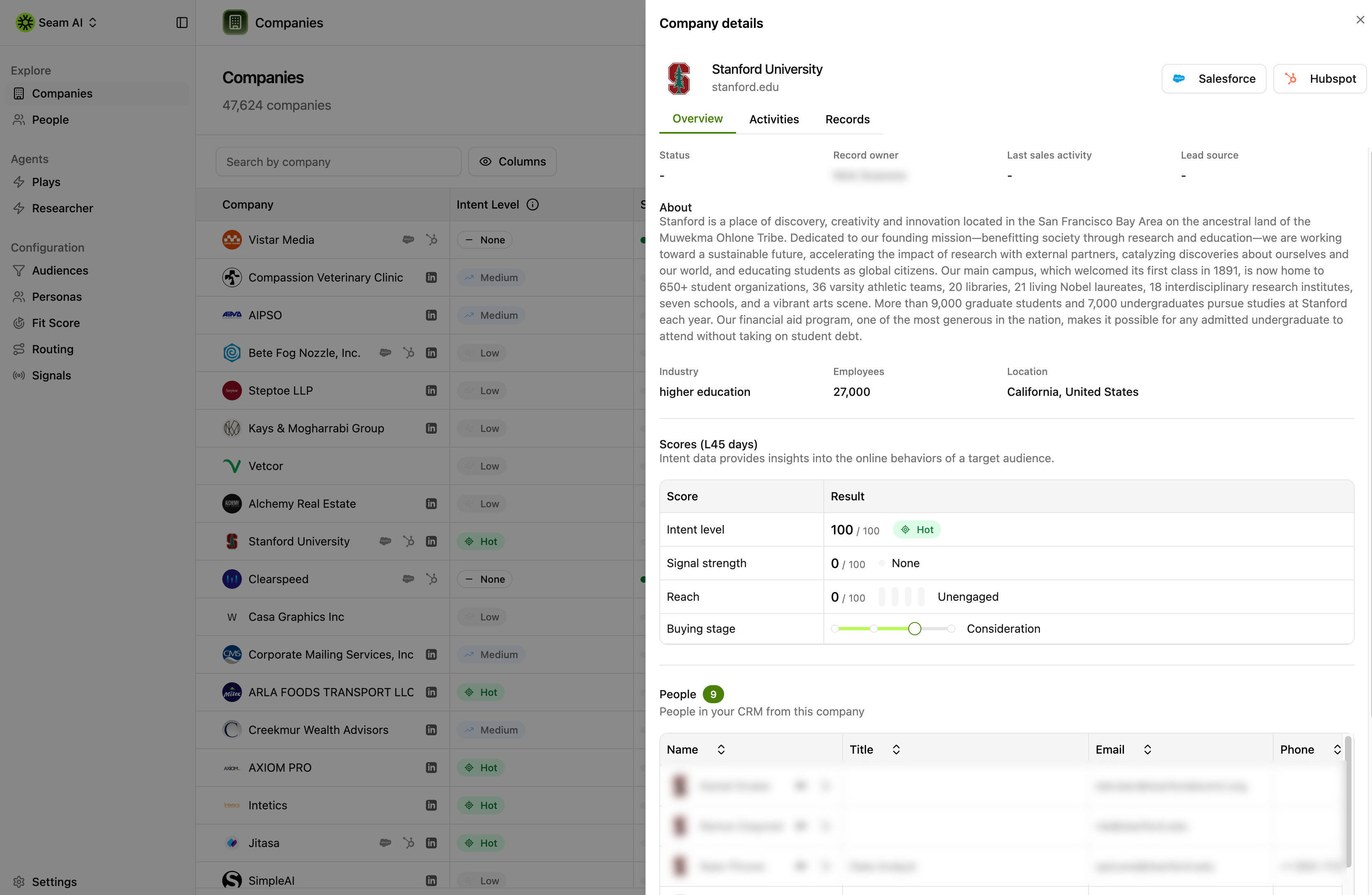 - Call data (metadata and transcript/summaries where available): Converted into structured intent signals (topics, pain points, competitors, sentiment) and associated with the correct account/contact.