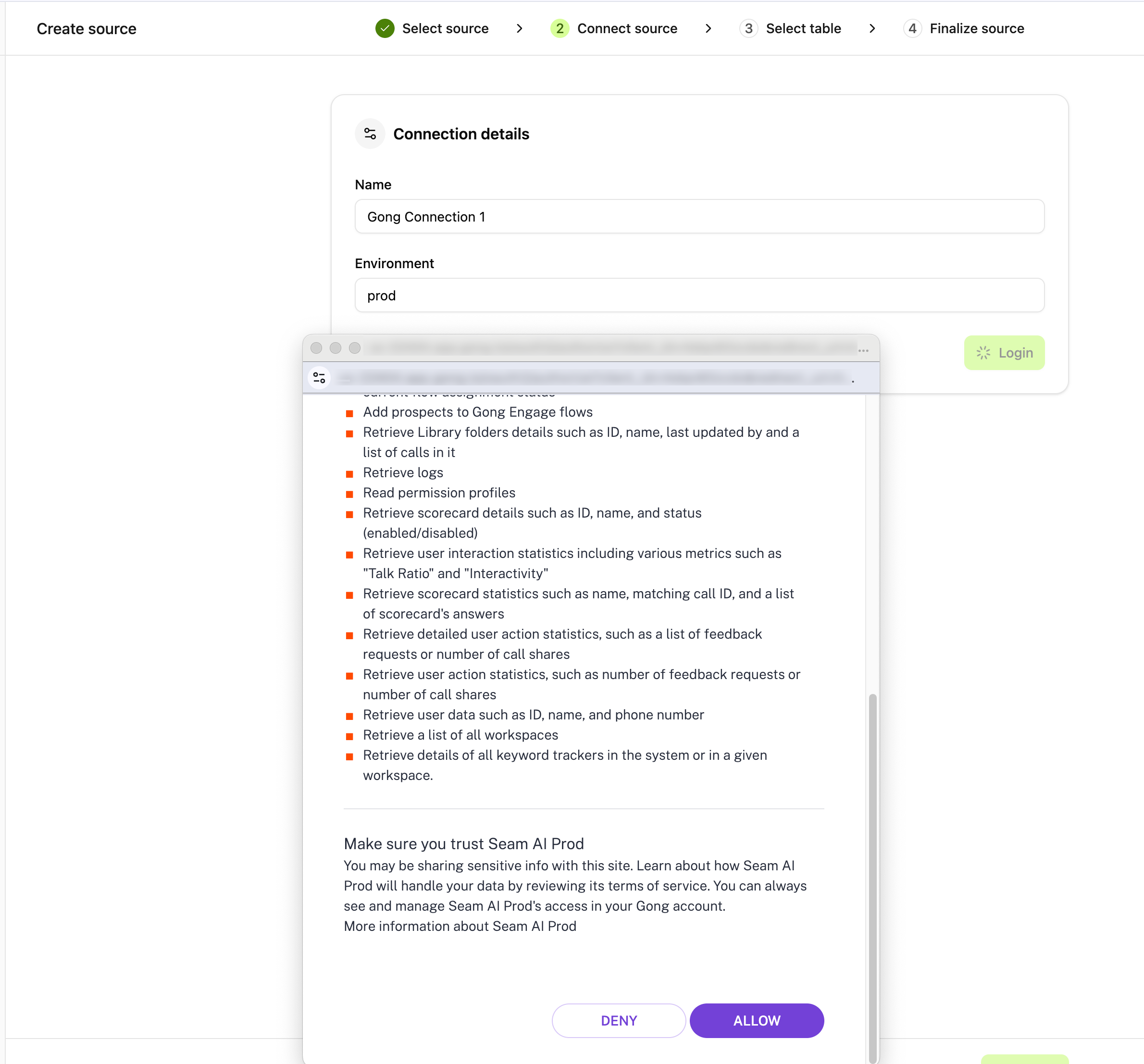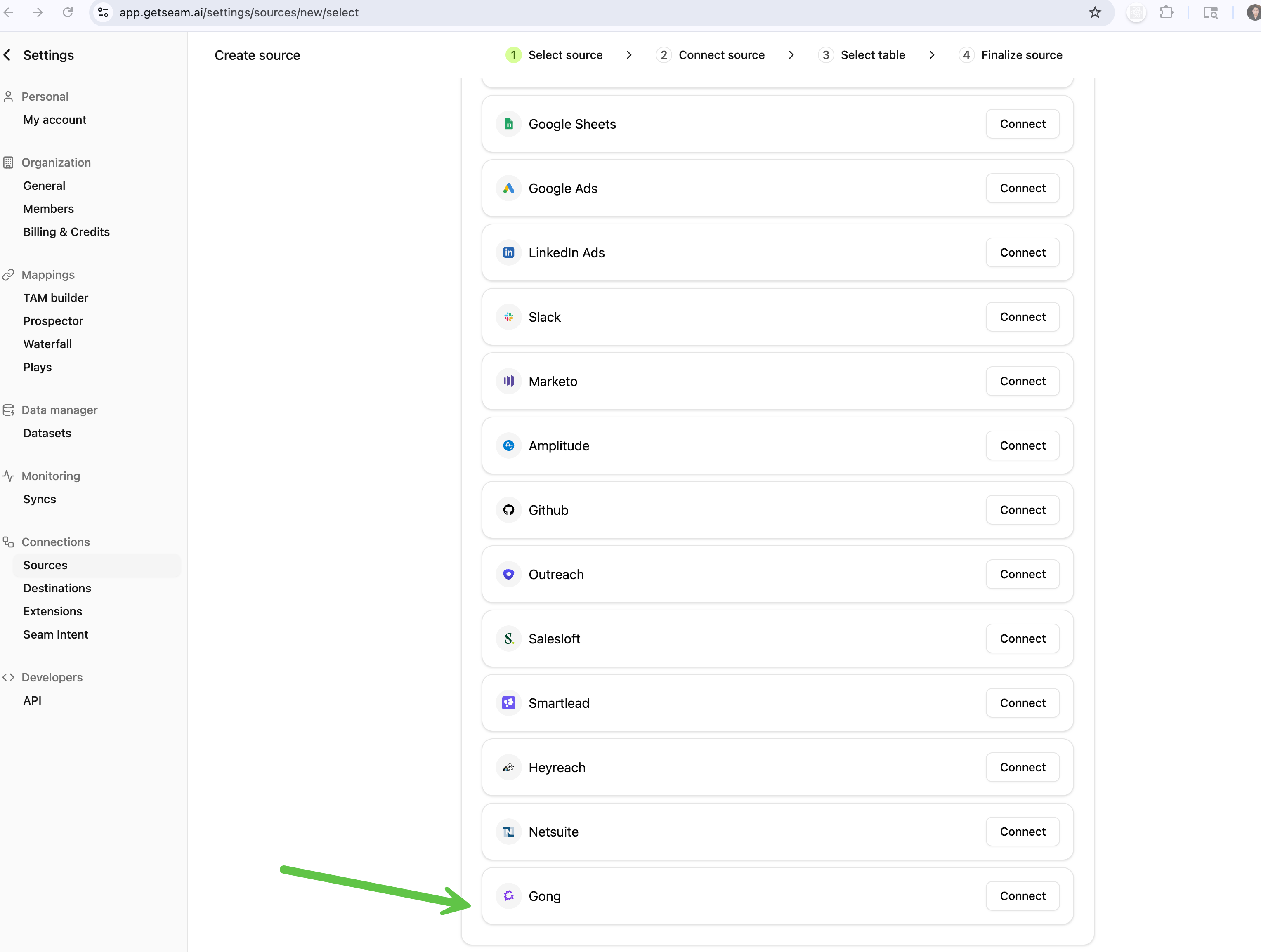 The connection to Gong is only set once by the org admin, this will allow seam to access to the Gong instance data.