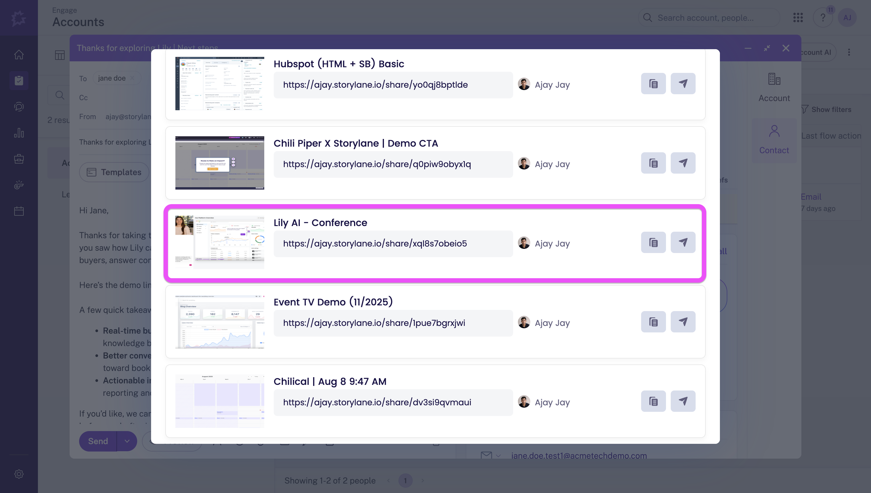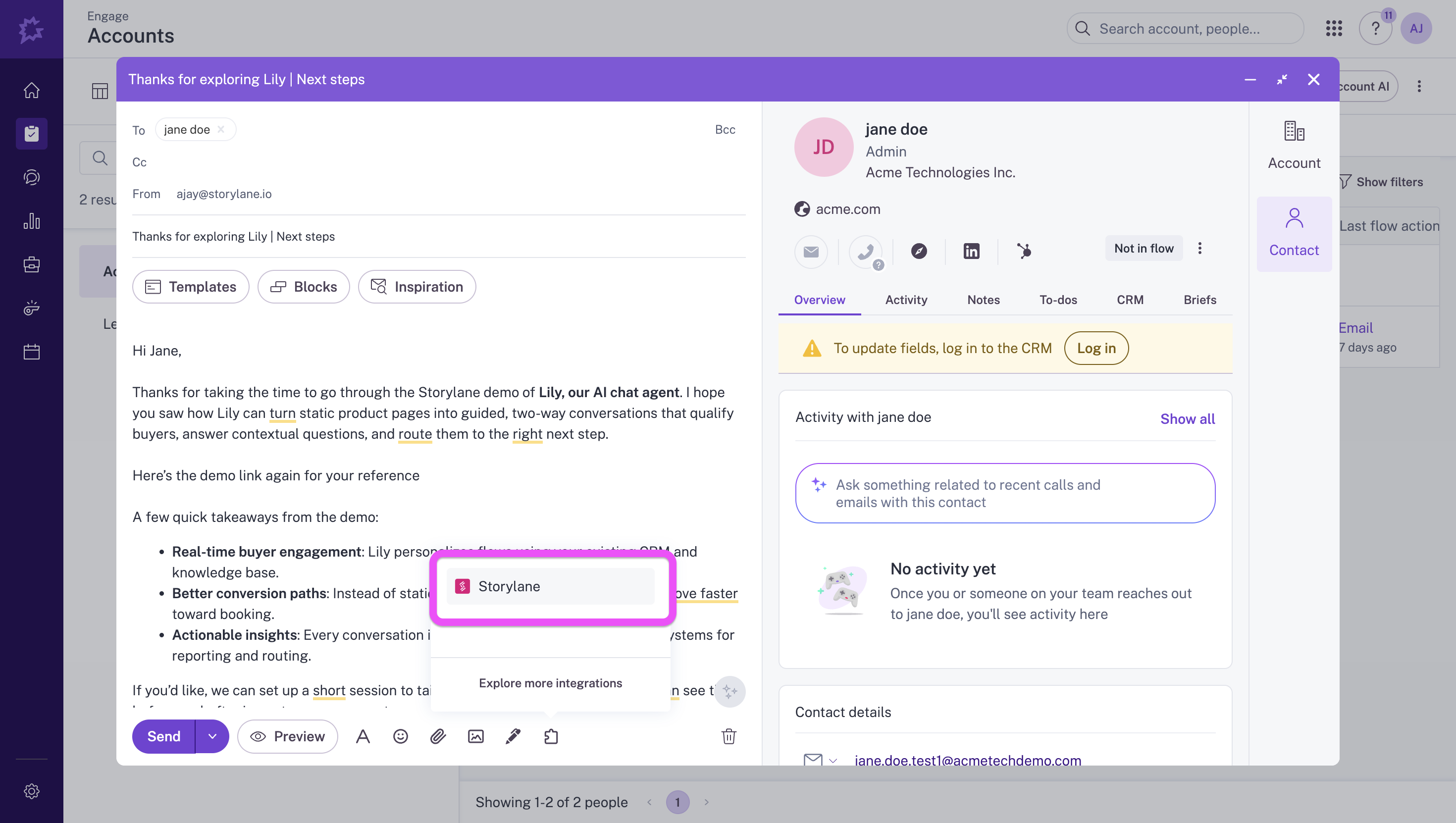 Revenue teams can browse and insert interactive Storylane demo links directly from the Gong Engage Email Composer, ensuring prospects see product value without leaving their inbox