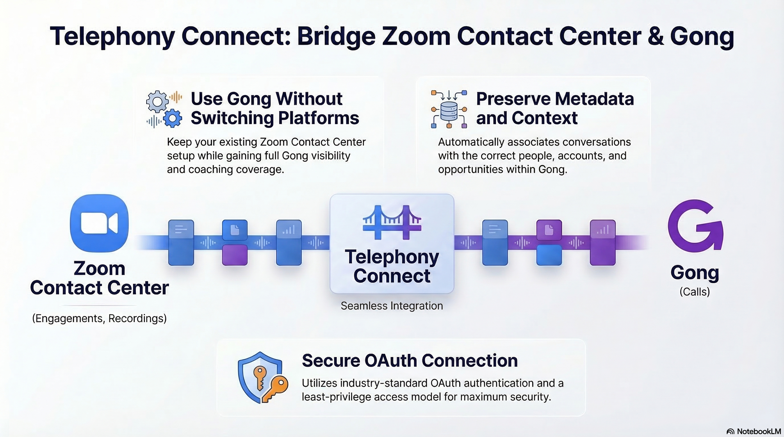 Telephony Connect for Zoom Contact Center brings Zoom Contact Center calls into Gong through a secure managed integration, allowing teams to capture and analyze customer conversations in Gong even though Gong does not natively support Zoom Contact Center.