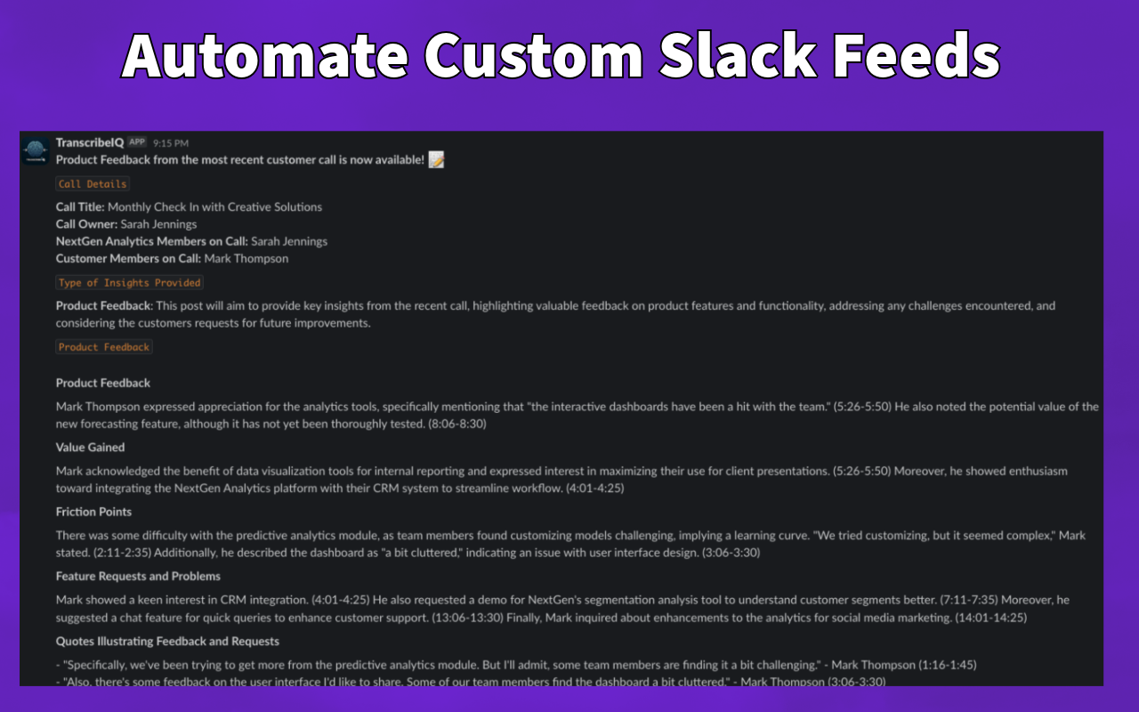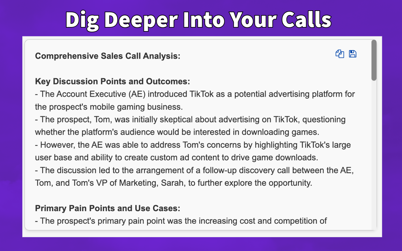 TranscribeIQ for Teams integrates directly with Gong to automate Call Analysis and send insights to Slack, G-suite (Docs, Sheets, Drive), and Chrome.