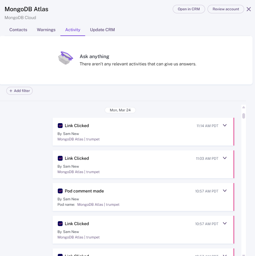 Pod analytics such as Views, Document Downloads, Comments or Completion of Mutual Action Plan Steps are sent to Gong Activity Timelines to facilitate more accurate forecasting.