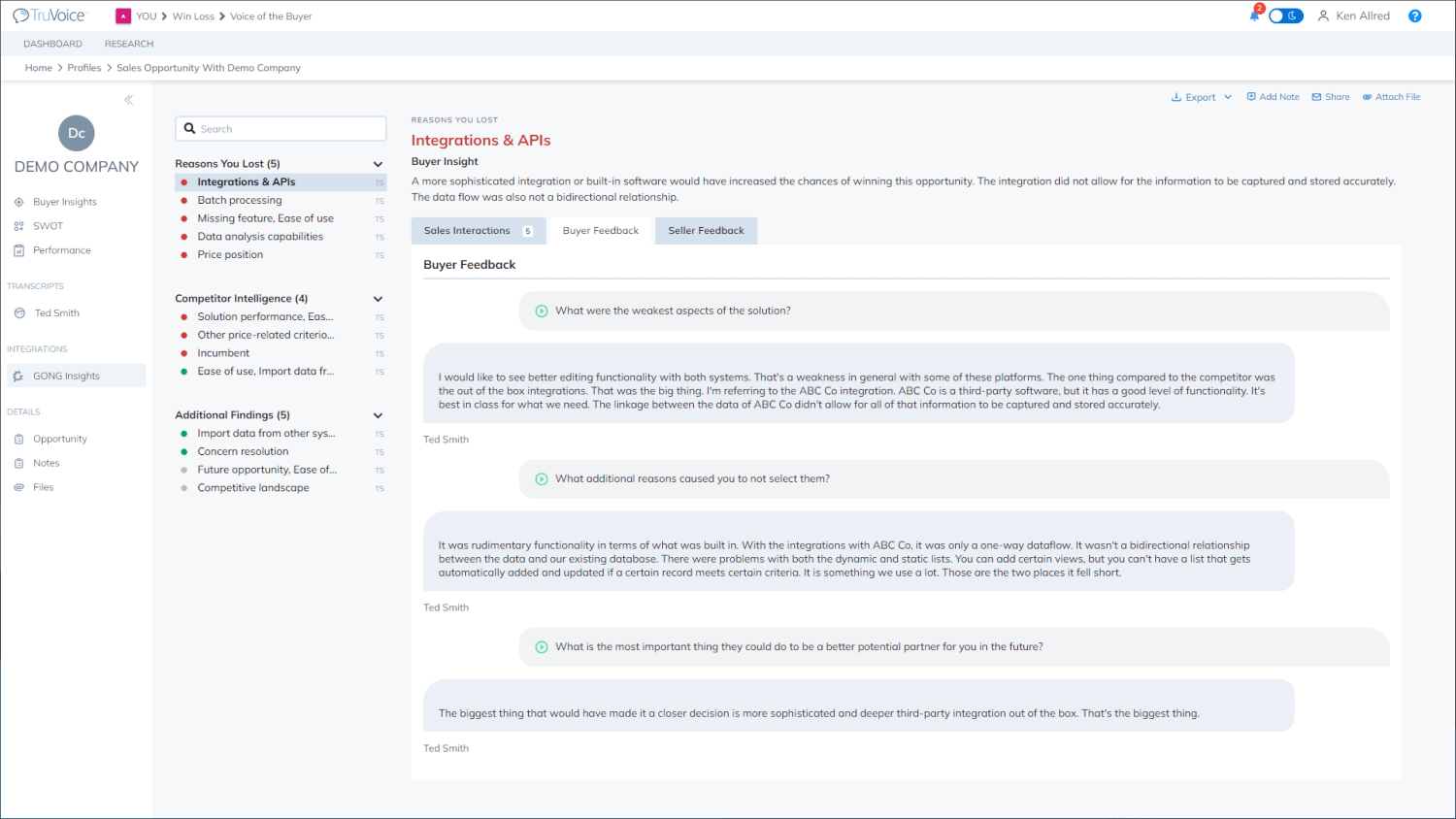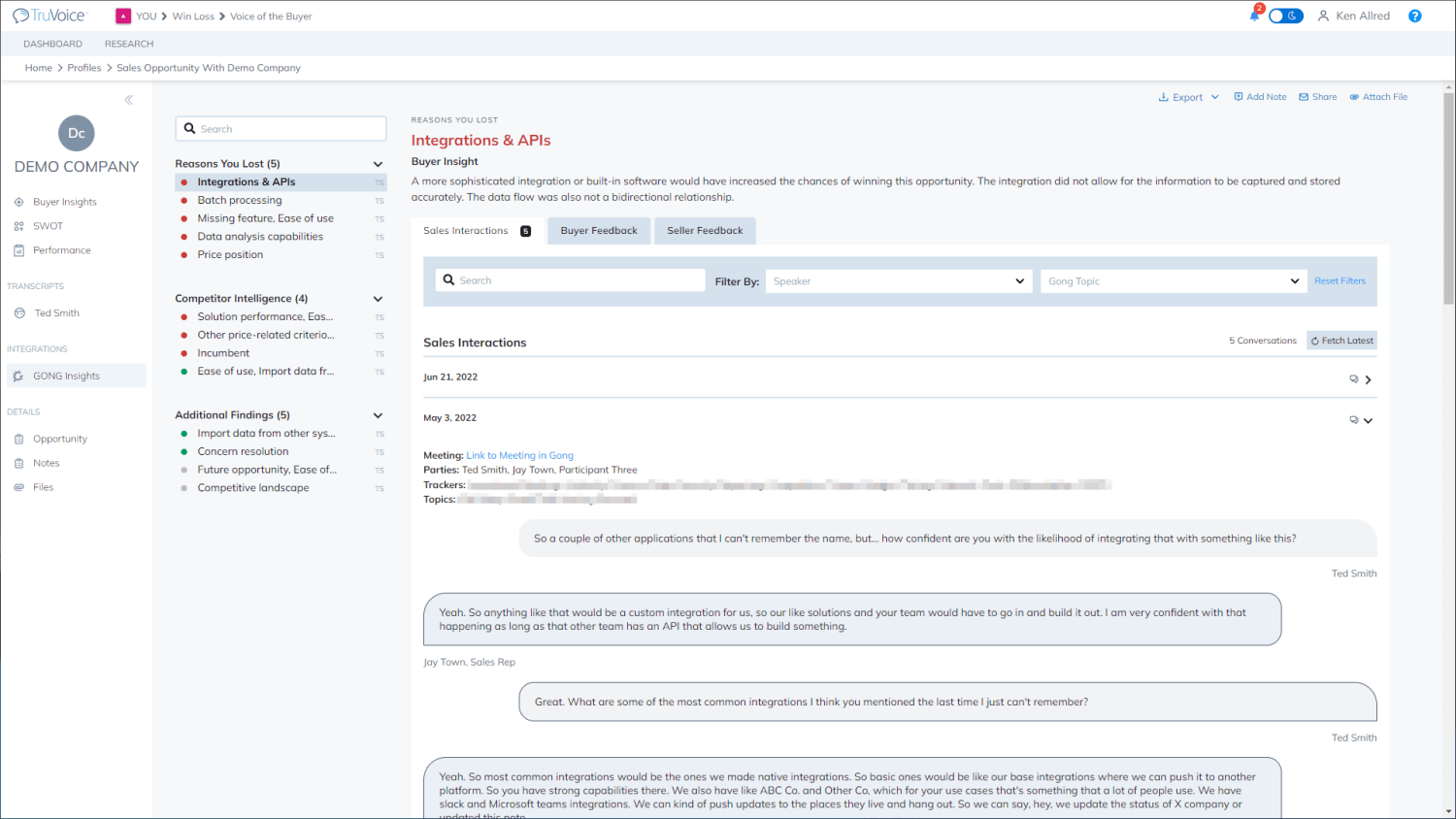 TruVoice automates capturing the reasons a deal was won or lost from your buyers. Adding Gong integration enables the TruVoice NLP (natural language processing) model to search for related sales interactions (key conversation snippets in your recorded Gong meetings) for each decision driver (reason for the win or loss) and automatically identify the sales interactions that were the root cause for the reason.