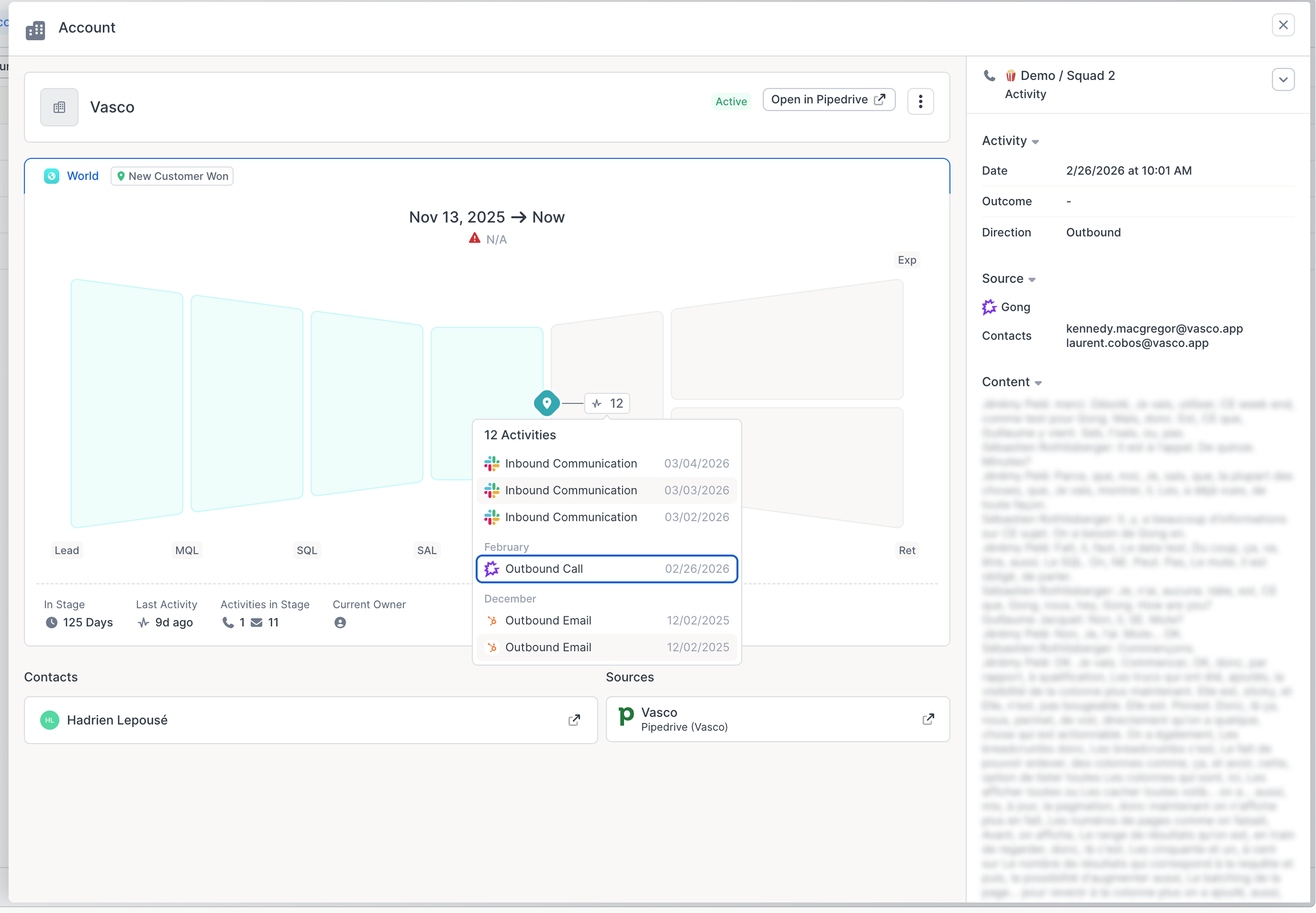 Vasco connects to Gong to bring your customer conversation data directly into your revenue workspace. Once connected, Vasco syncs call transcripts and participant information from Gong. Participants are automatically matched to customer accounts using their email domain, so every call is surfaced in context — linked to the right account in your Data Hub. This allows your team to review conversation history, track communication frequency, and get a full activity timeline per account without leaving Vasco.