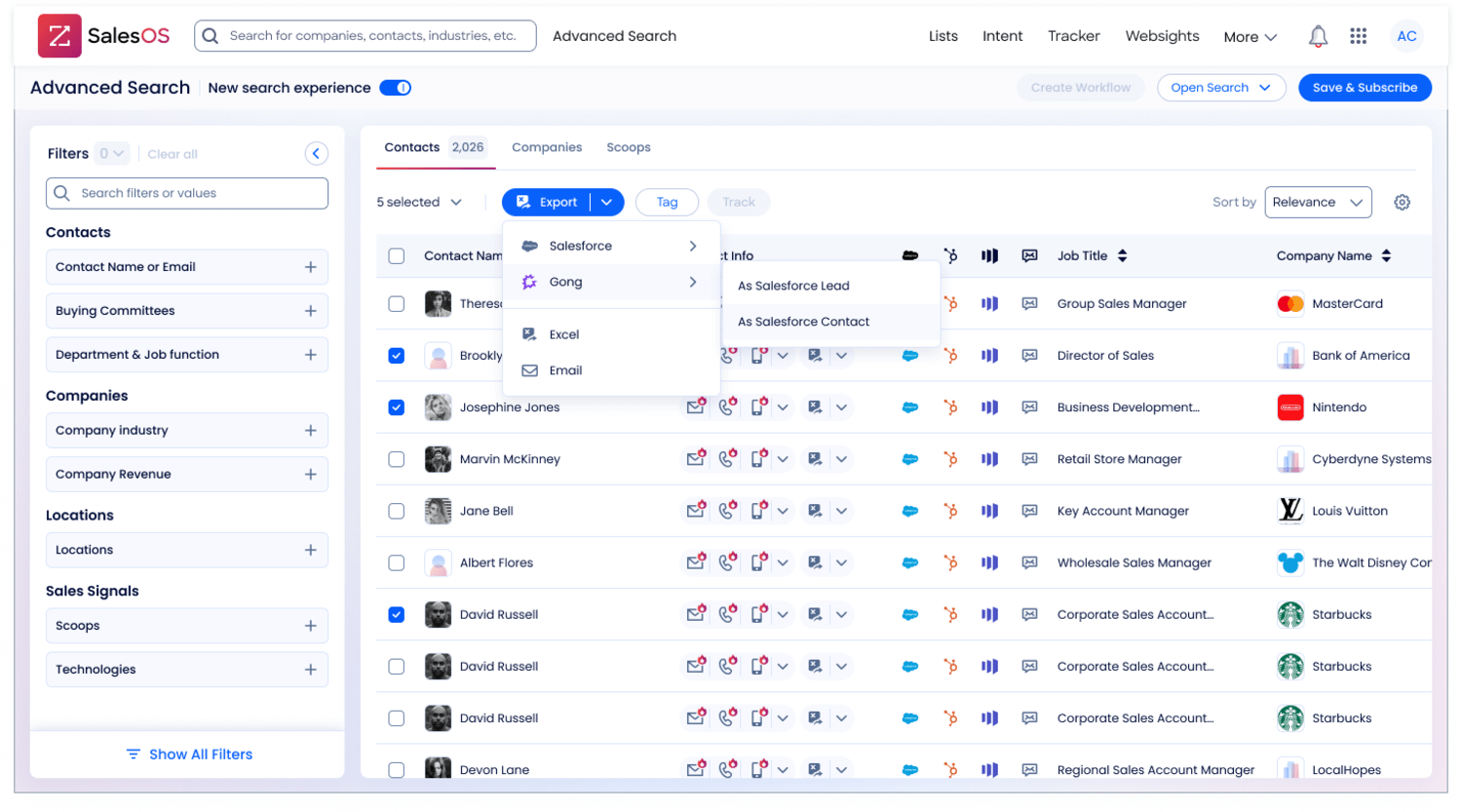 Identify a curated selection of target contacts backed by scores of data and export to Gong Engage Flows right from Zoominfo.