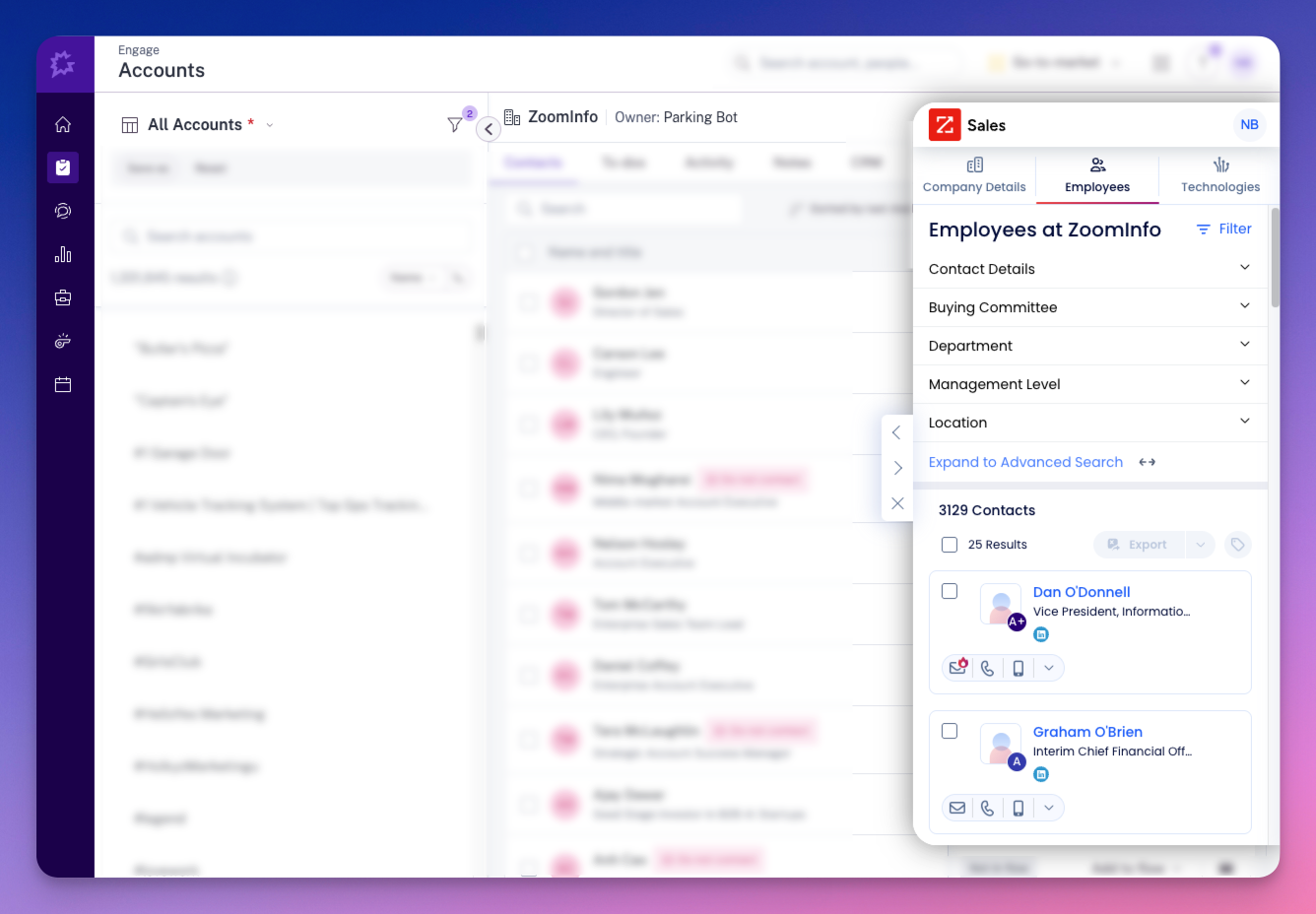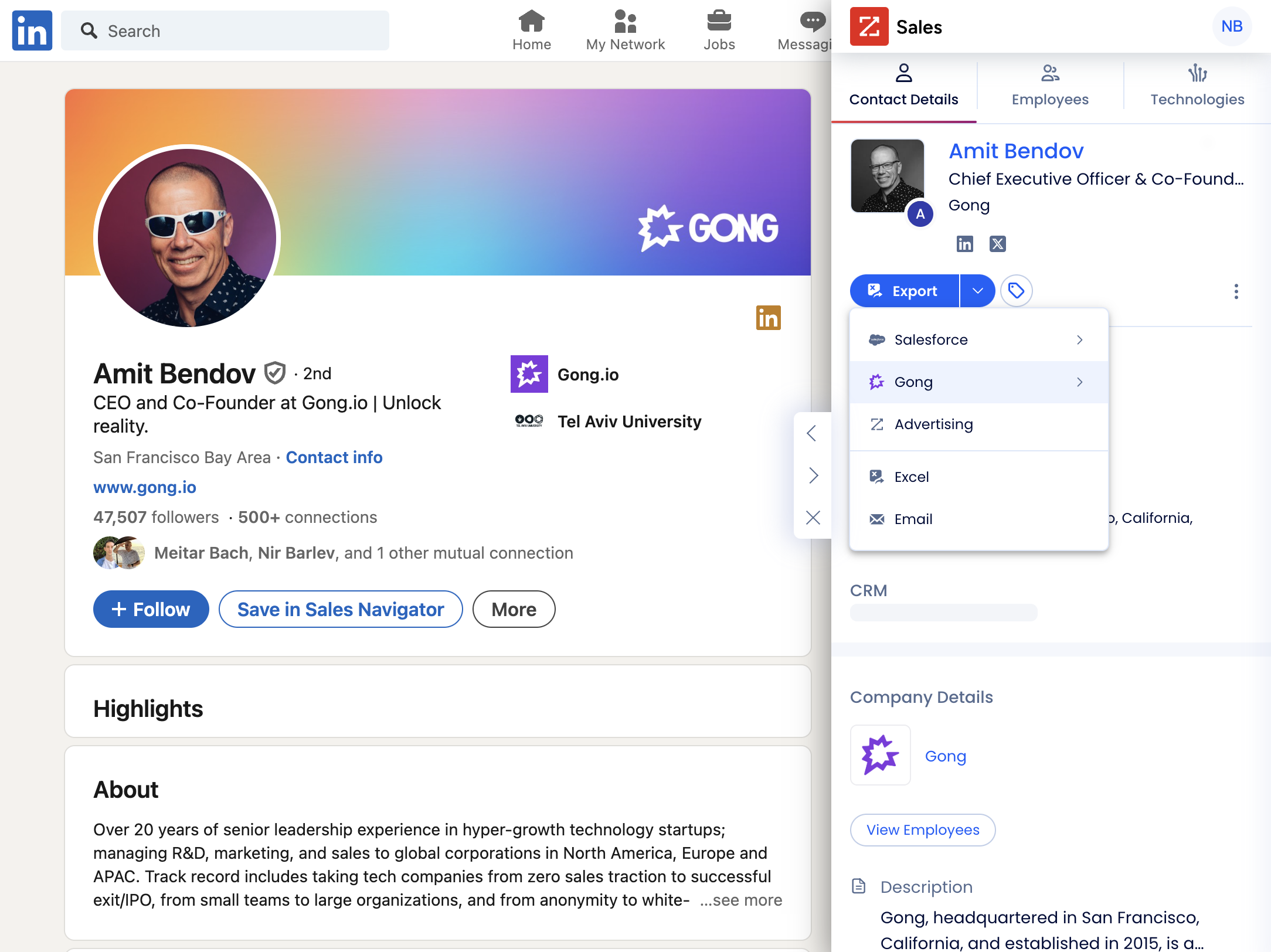 ZoomInfo's Chrome extension now works seamlessly over Gong, just like it already does with LinkedIn, Salesforce, Gmail, and other platforms.